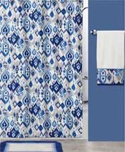 An updated Ikat pattern of Navy, Monaco Blue, Dusk Blue and Grey on an Ivory ground cotton duck shower curtain. This same pattern is also attached to the hem of the Ivory cotton towels. To complete the look a tufted cotton rug in the same color tones.