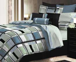 BLAIR offers a contemporary look for a modern bedroom. The design encompasses a simple block layout of cool shades of blue, green and white with bold black accents and reverses to a solid blue. The clean lines in this fresh color palette compliment most styles of furnishings. The components are enhanced with a black cording. The styling of BLAIR is tailored and simplistic. Decorative pillows have detailed craftsmanship. The square cushion is made of an embroidered geometric pattern on black micro suede. Other pillows have piecing and gross grain ribbon accents. Printed sheet sets are 100% cotton, 250 thread count.