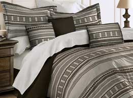 Talavera is a stylish seven piece comforter set. The comforter and shams taupe ground showcase the chocolate brown tribal inspired pattern. The decorative pillows reverse to brown allowing for a mix and match look. The brown bedskirt is kick pleated. Talavera is a trendy must for any decor.
