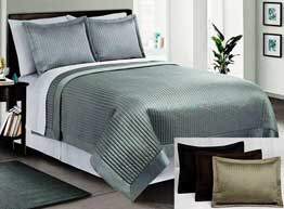 TRIBECA is a solid color ribbed quilt that is available in four (4) colors black, grey, taupe and brown. It has substantial weight, lustrous sheen and a soft finish. The quilt has a flanged border and mitered corners. This quilt will compliment any bedroom decor. Face, reverse and fill are 100% polyester.